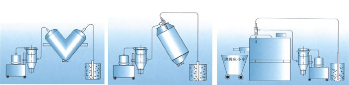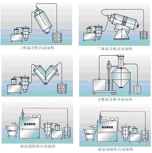 现在多数制药厂V型混合机、三维运动混合机靠人工装料,工人劳动强度大,粉尘外溢,生产车间无法通过GMP认证。混合机自动上料机彻底解决了这一难题。它不需外接真空。不需要压缩空气,粉料、颗粒料都能自动进入各种混合机。该机由吸料嘴、布袋过滤器、振打清理器和真空泵组成整套系统设计合理,制造精美,拆装方便,符合要求。