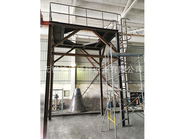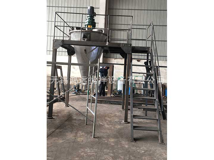 由摆线减速机连接中心螺杆及外层螺带以相同转速运转。工作时中心螺杆将混合物料由底部提升到顶部,同时线速度较大的外部螺带将物料由下向上沿锥形桶壁盘提升,两种运动在离心力作用下又将物料沿切线方向抛向空间,物料产生强烈的对流剪切、扩散,从而达到快速混合的目的(中心螺杆也可做成反向螺杆)。